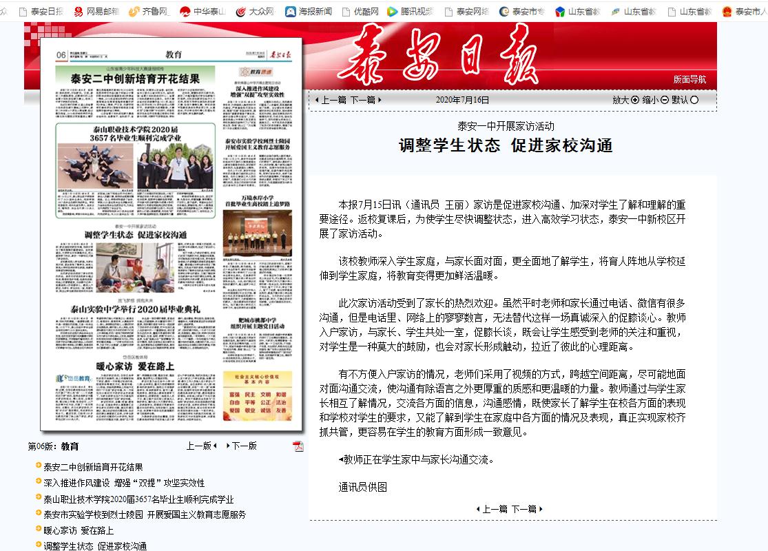 泰安日报:泰安一中新校区开展家访活动