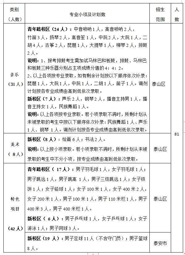 泰安一中2021年艺体特长生招生计划分为艺术类特长生计划和体育专项特色项目计划。其中,篮球和足球特色项目面向泰安市招生,其它类面向泰山区招生(招生计划及相关要求见附件)。