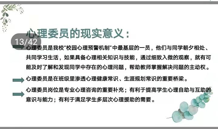 接着老师讲解了心理委员工作相关事宜,令全体心理委员认识到了一名心理委员的重要性,也明确了自己的职责,更让大家明白了该如何开展工作。